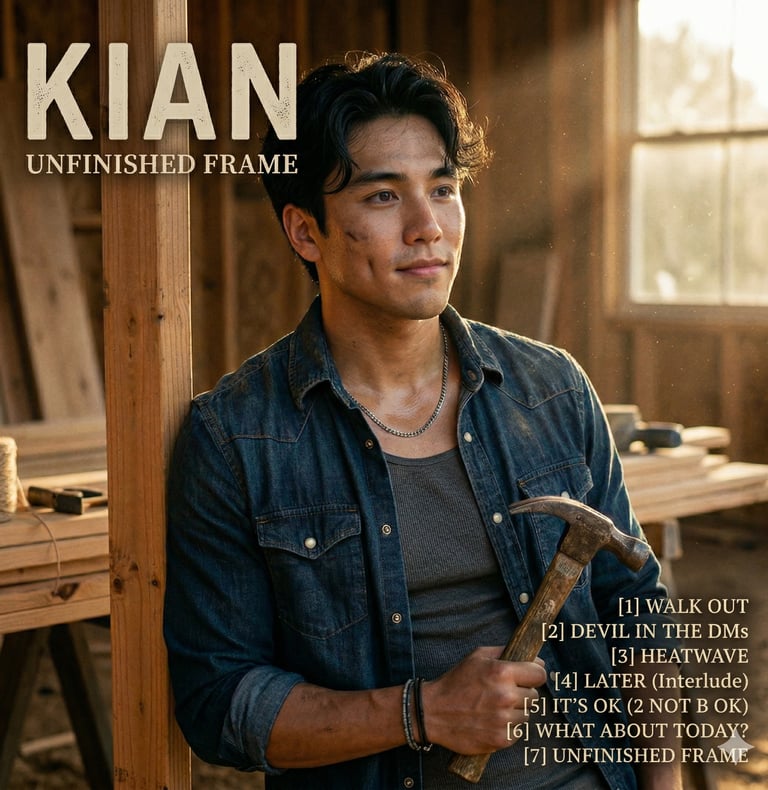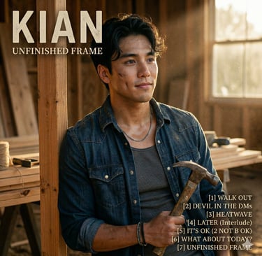 Kian’s debut E.P. Unfinished Frame blends bold theater-pop anthems with raw acoustic truths. From digital wit to soaring finales, it’s the honest blueprint of an artist still under construction.