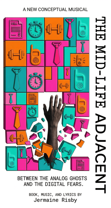 Mid-Life Adjacent is a contemporary conceptual musical in two acts that explores the complexities of identity, aging, and the digital experience for the millennial generation. Written by Jermaine Risby (also known as Jay Rr), the production utilizes a blend of contemporary musical styles—including driving piano, rhythmic jazz-patter, and aggressive synth-pop—to depict the transition from a "curated" digital existence to an "unfiltered" reality.