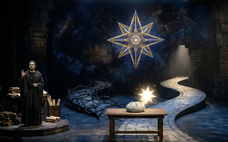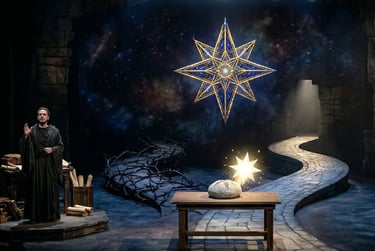 Musically and theatrically, this story demanded something more visceral than a traditional "Bible play." It required the "Sondheim Corrosion"—a sense that the very architecture of the material world is dismantling itself. It needed the rhythmic urgency of a "Hamilton-style" hurricane to deliver complex Gnostic cosmology with the high stakes it deserves. Most importantly, it needed the surrealist, "impossible" stagecraft of a Sarah Ruhl—where bread can turn into birds and breath can become gold thread—to remind us that the world we see (the Kenoma) is often just a paper-thin illusion covering a blinding, spiritual Fullness (the Pleroma).